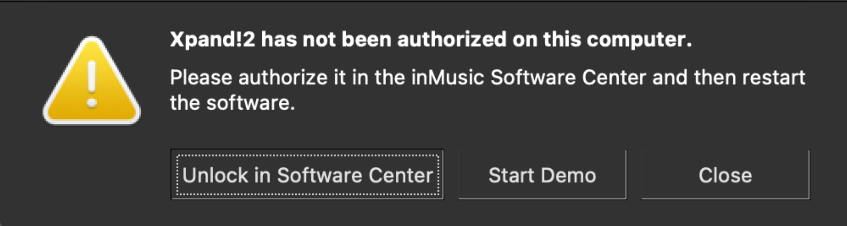 I am receiving an error that I need to authorize the software through the InMusic Software Center. What do I do?